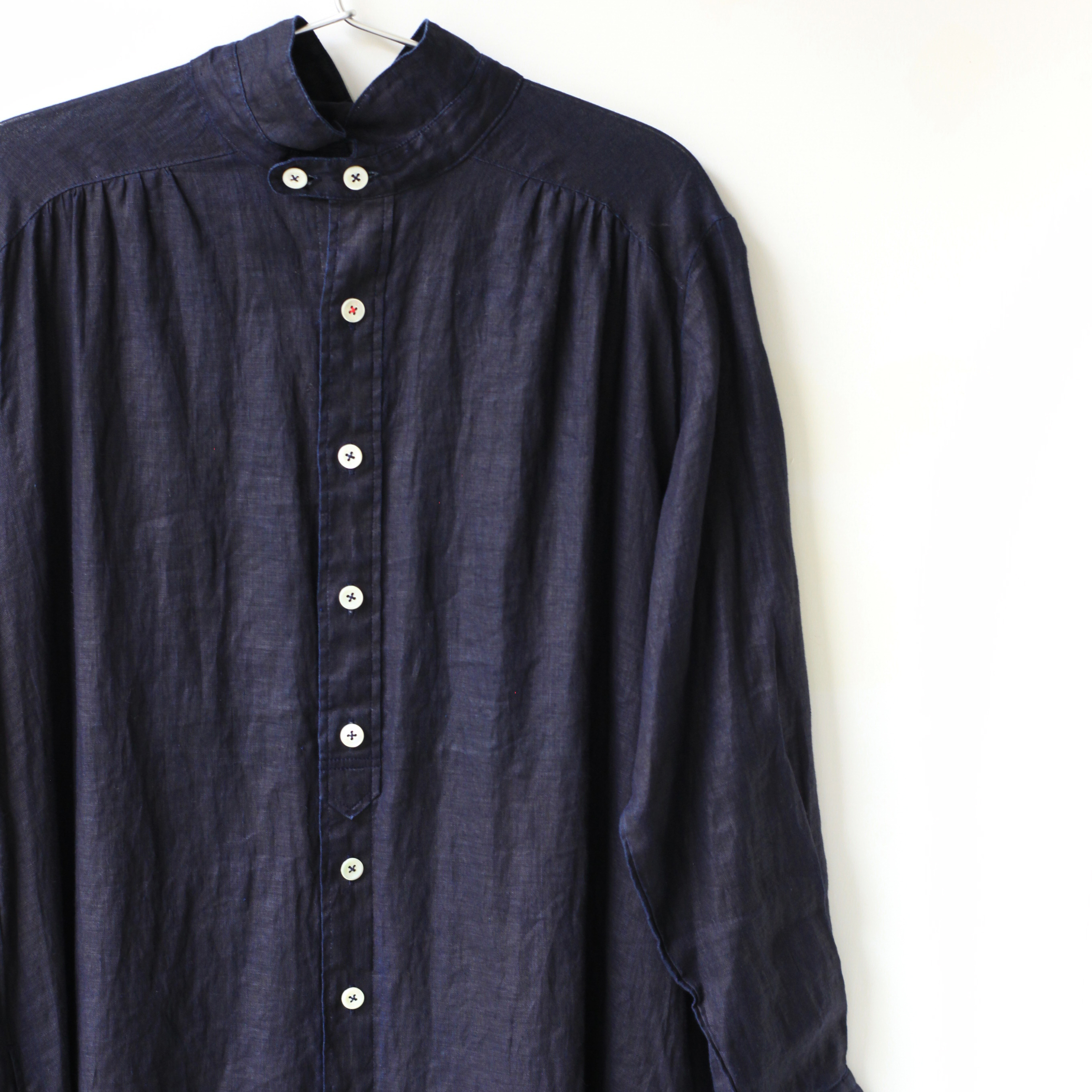 T-171小領前褶長袖OP棉麻(深indigo)