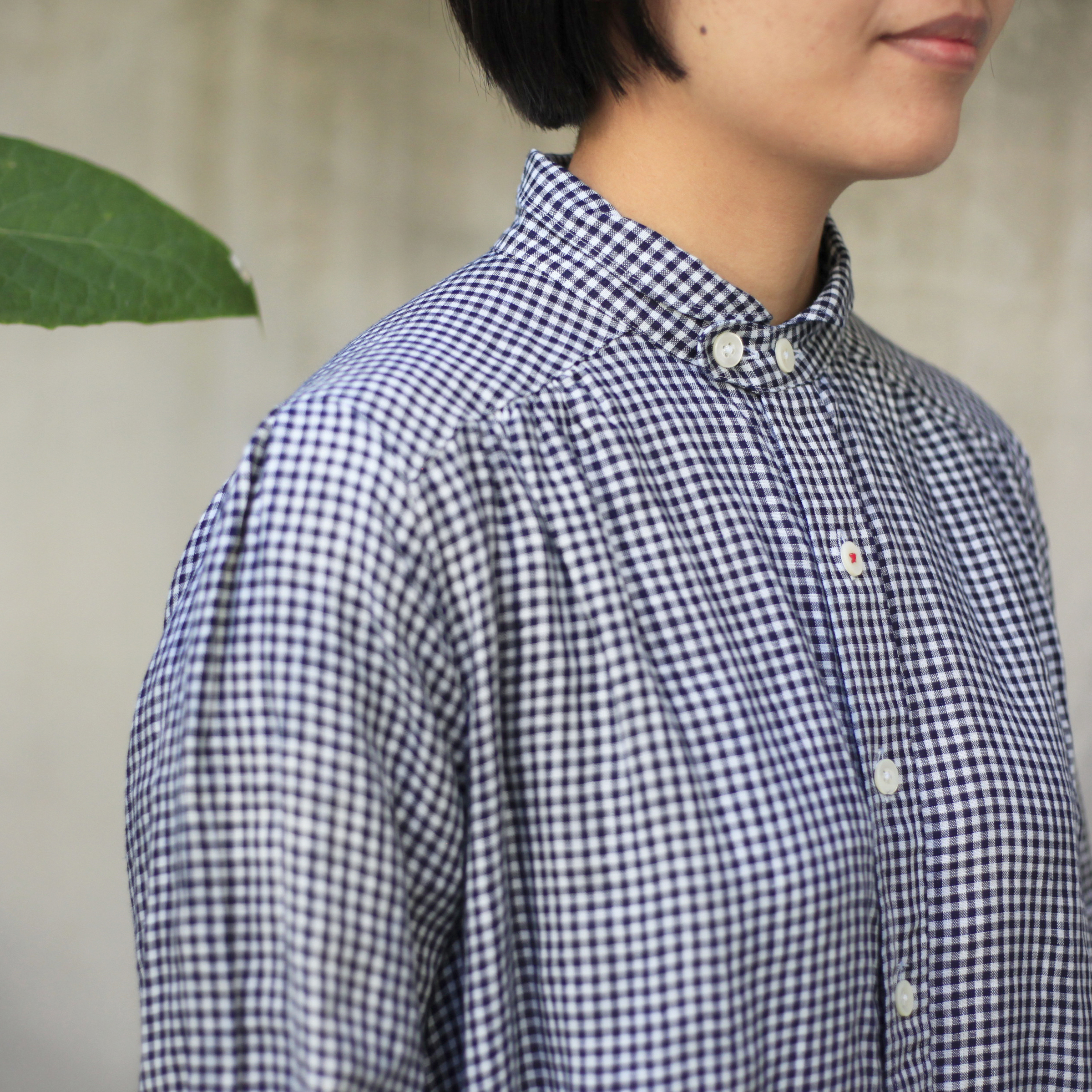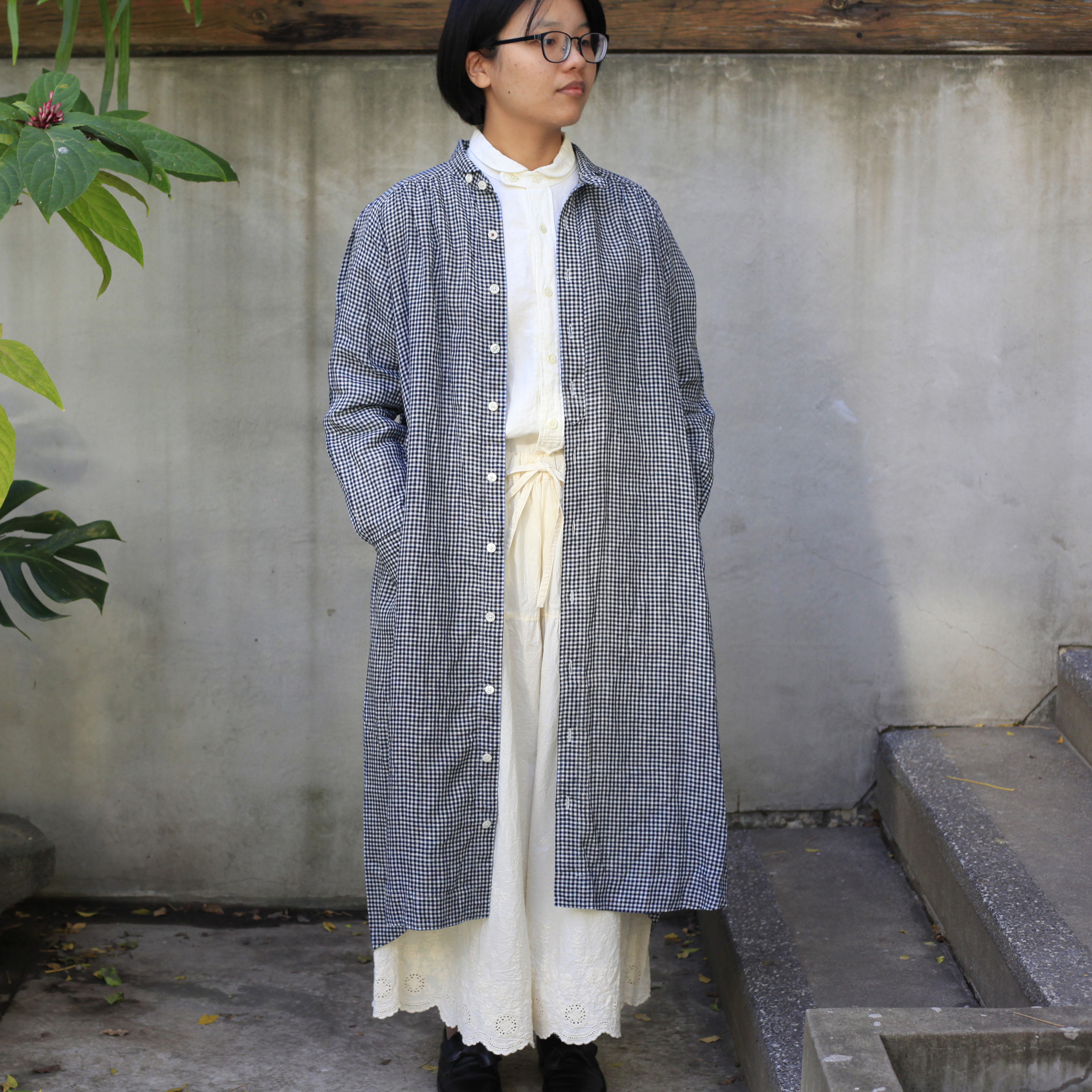 T-171小領前褶長袖OP棉麻(小格/黑/深indigo/indigo/米白)