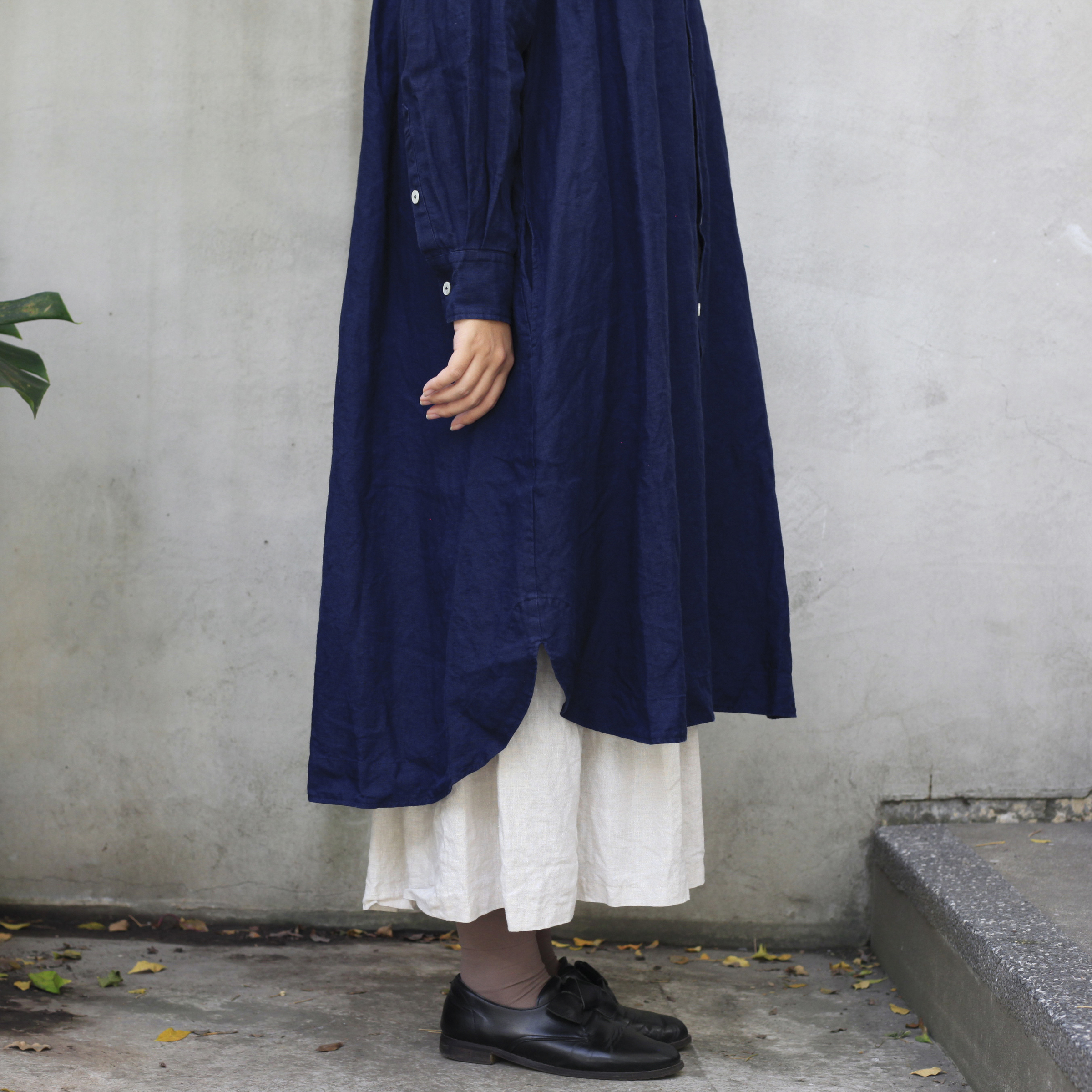 T-171小領前褶長袖OP棉麻(Indigo)