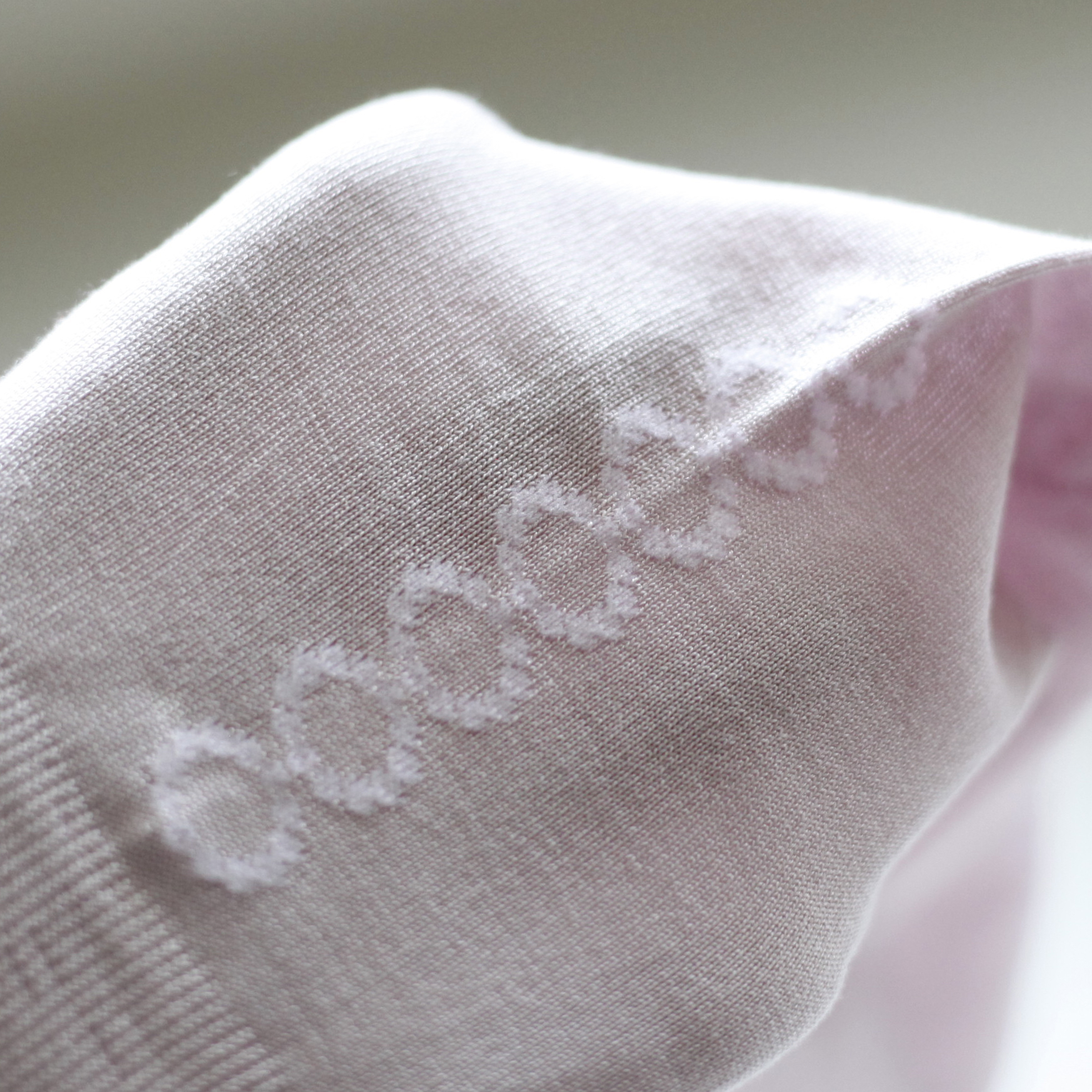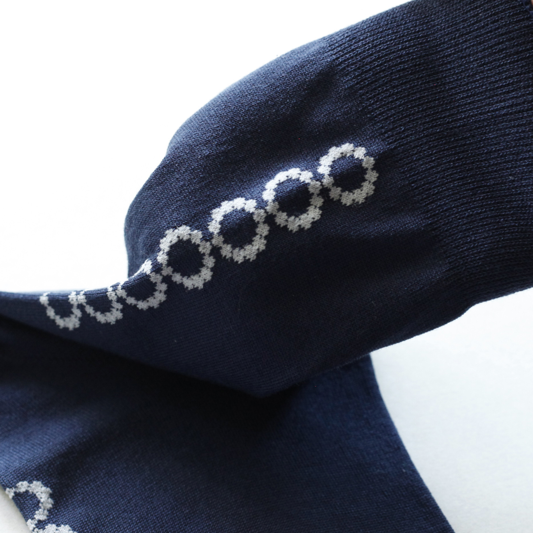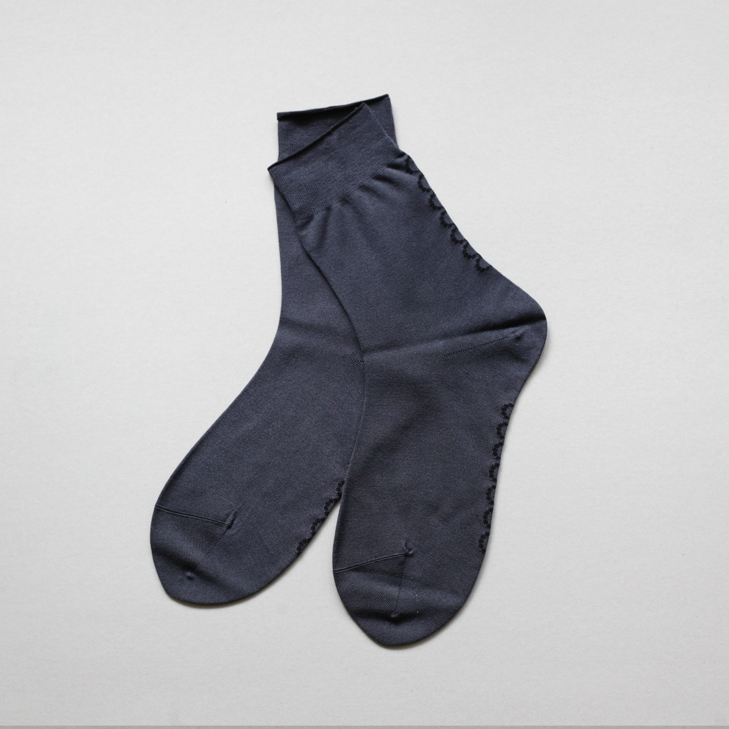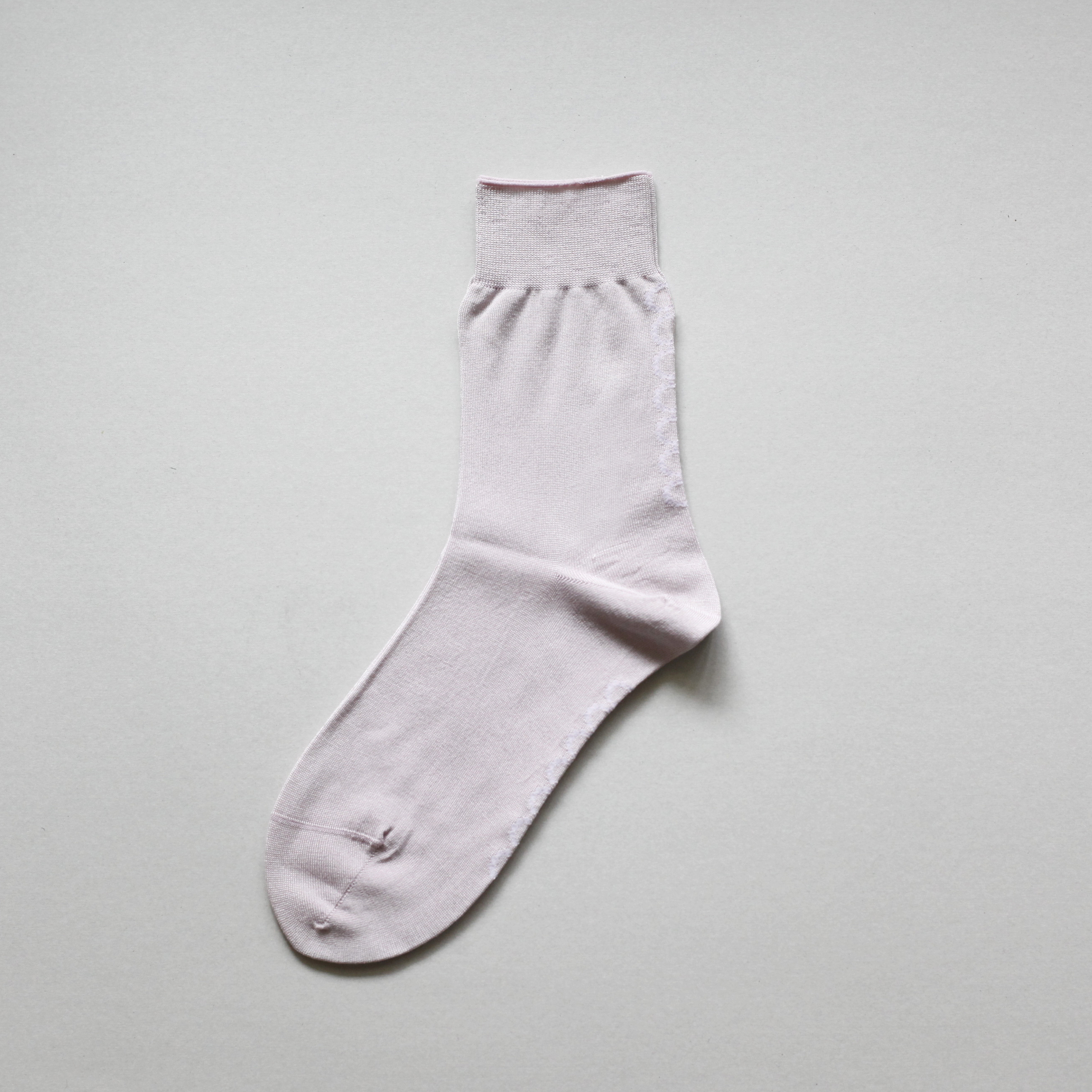這是一款以高品質絲線為基礎,精心編織而成的襪子。襪子的背面,一個讓人聯想到珍珠的小鈴鼓,自襪端圖案延伸到襪底,為背面風格增添色彩。 與高跟鞋風格相搭,適合正式場合。